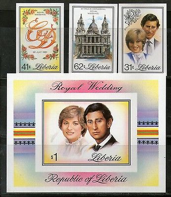 Liberia 1981 Diana & Charles Royal Wedding 3v + M/s IMPERF MNH # 12986