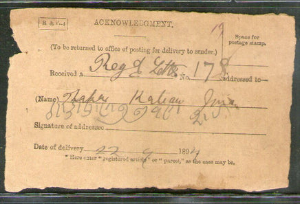 India 1896 Amran B.O. / Kattywar to Karachi Canc on Acknowledgement # 5888