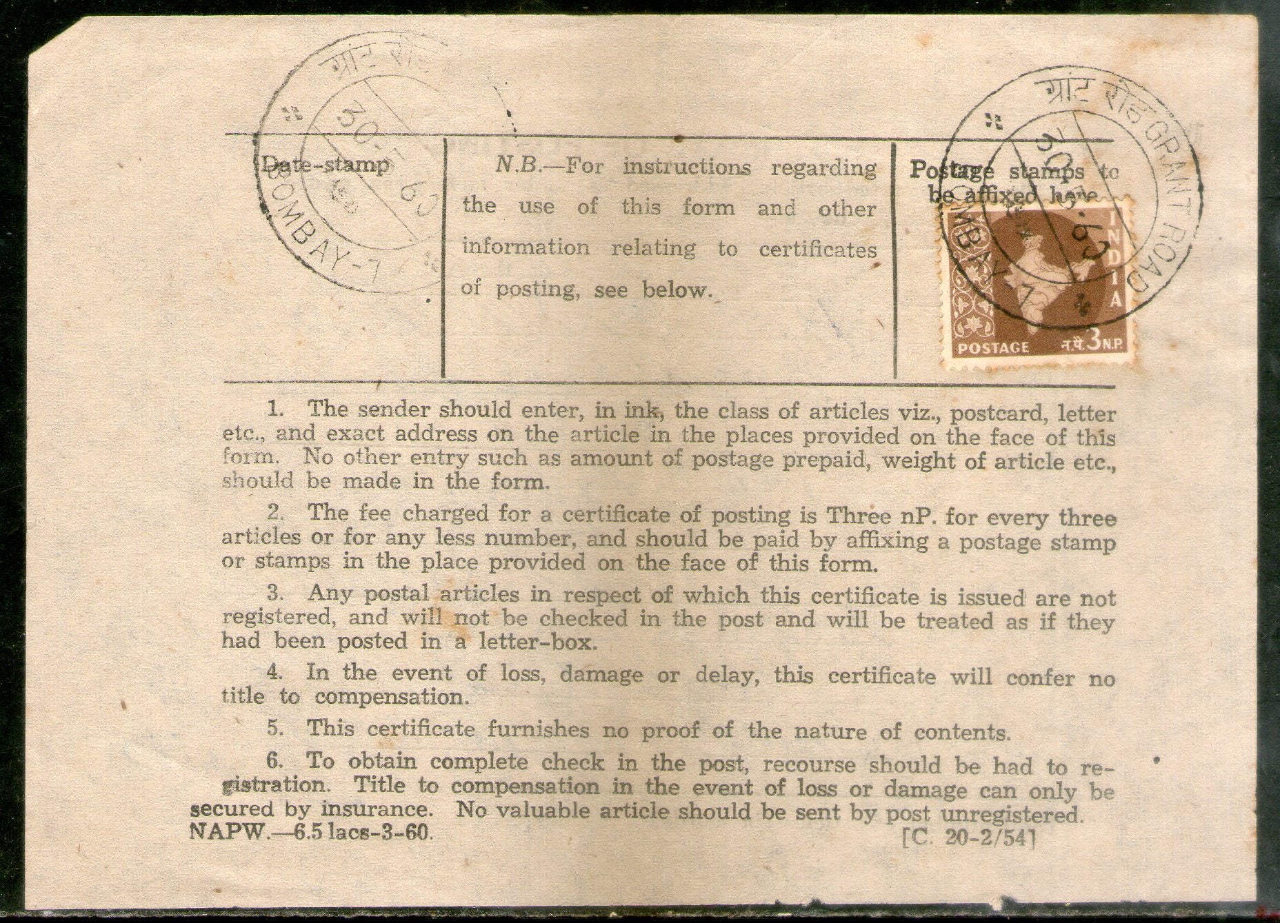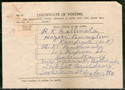 India 1960 Grant Road Bombay tied Certificate of Posting form # 7635