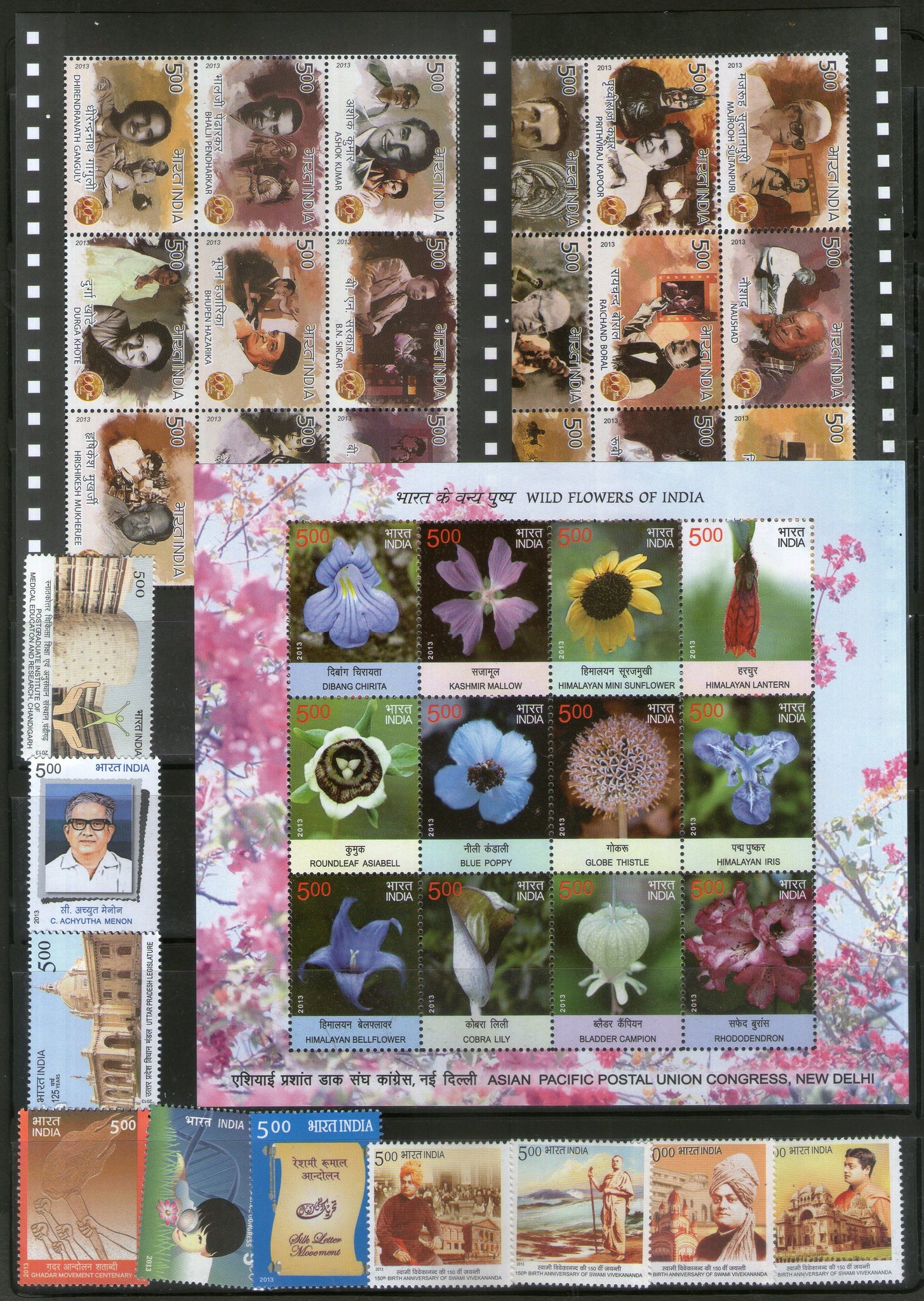 India 2013 Year Pack of 120 Stamps Cinema Animals Flowers Cricket Dam Train MNH