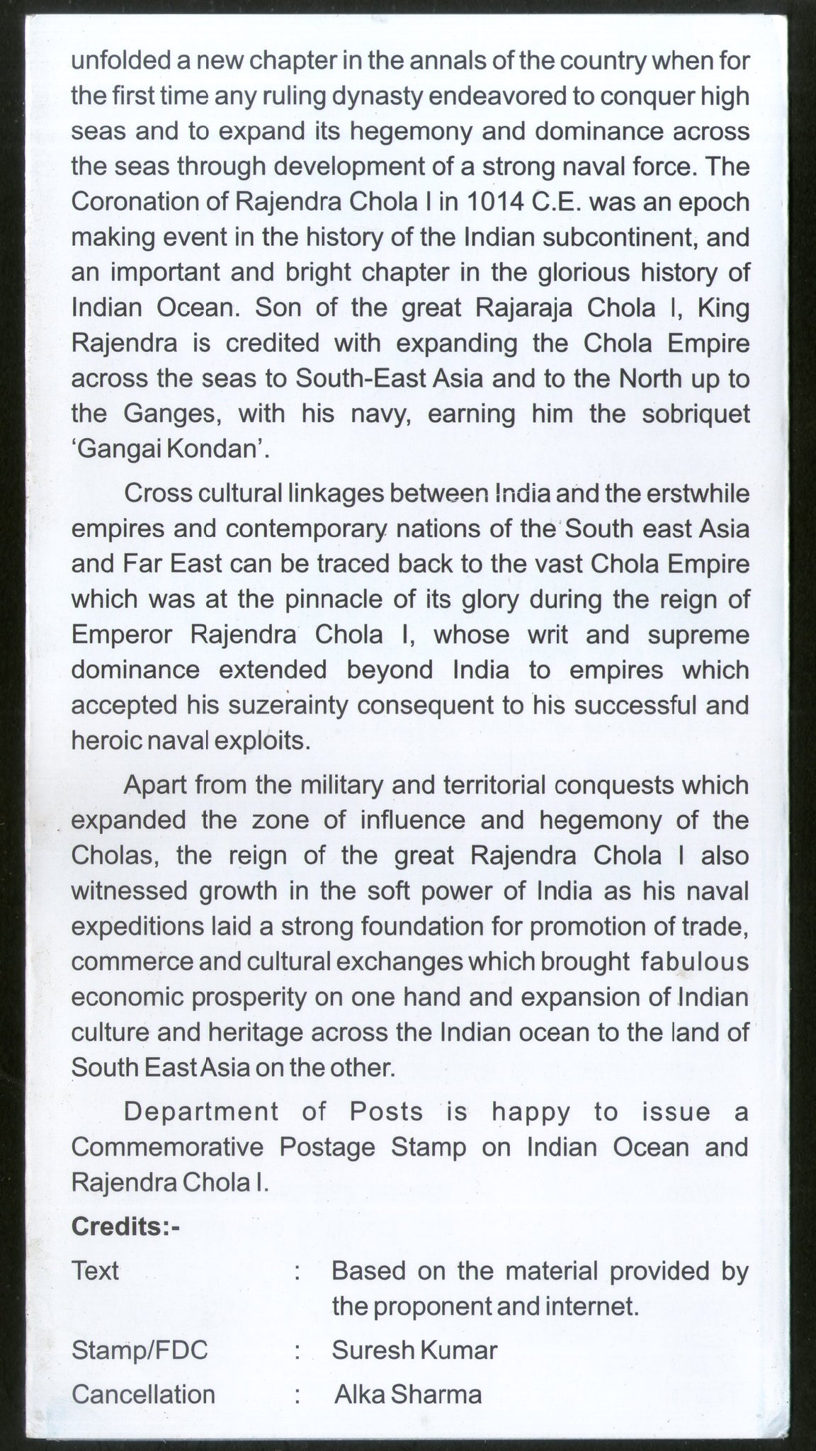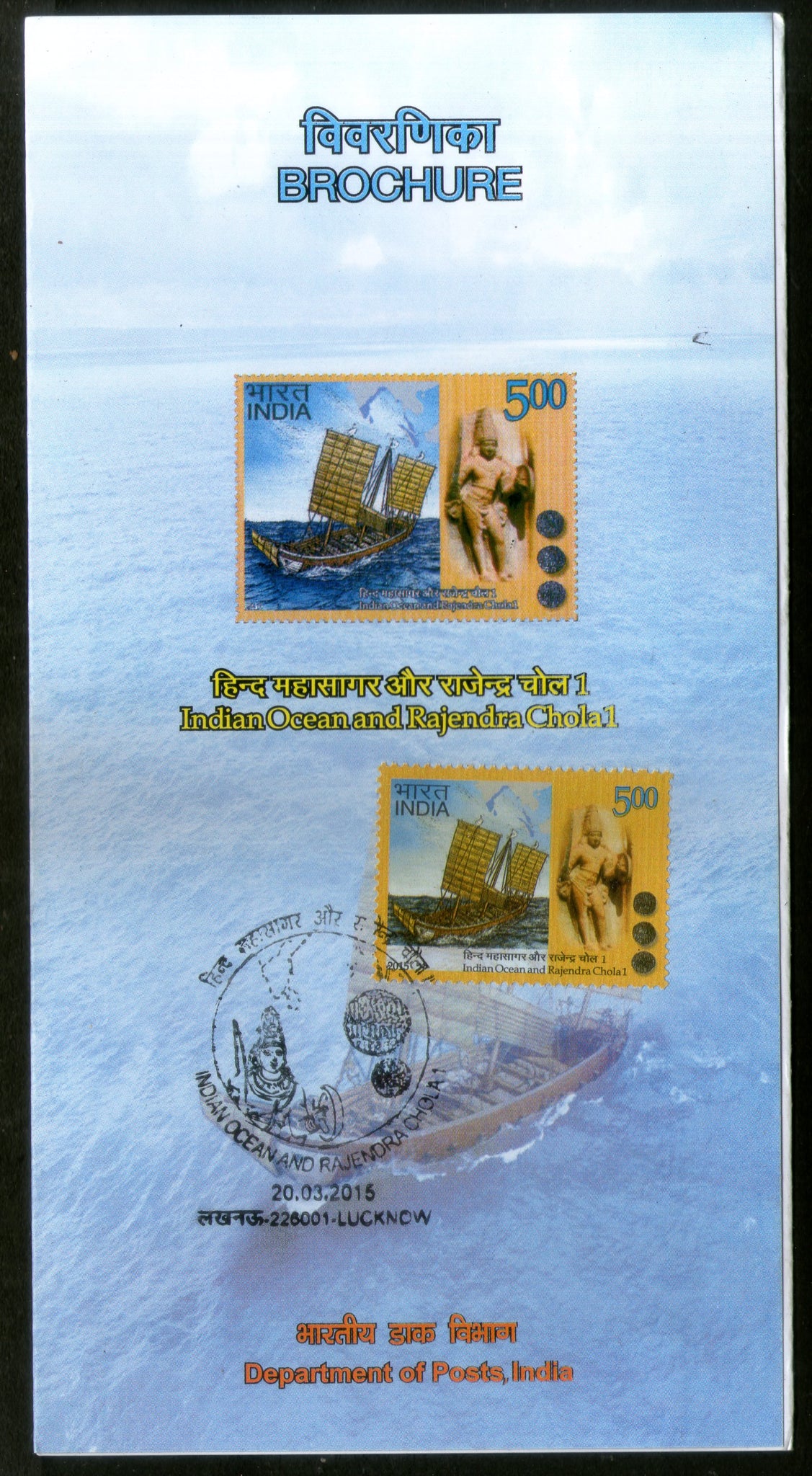 India 2015 Indian Ocean and Rajendra Chola Sculpture Art Ship Cancelled Folder