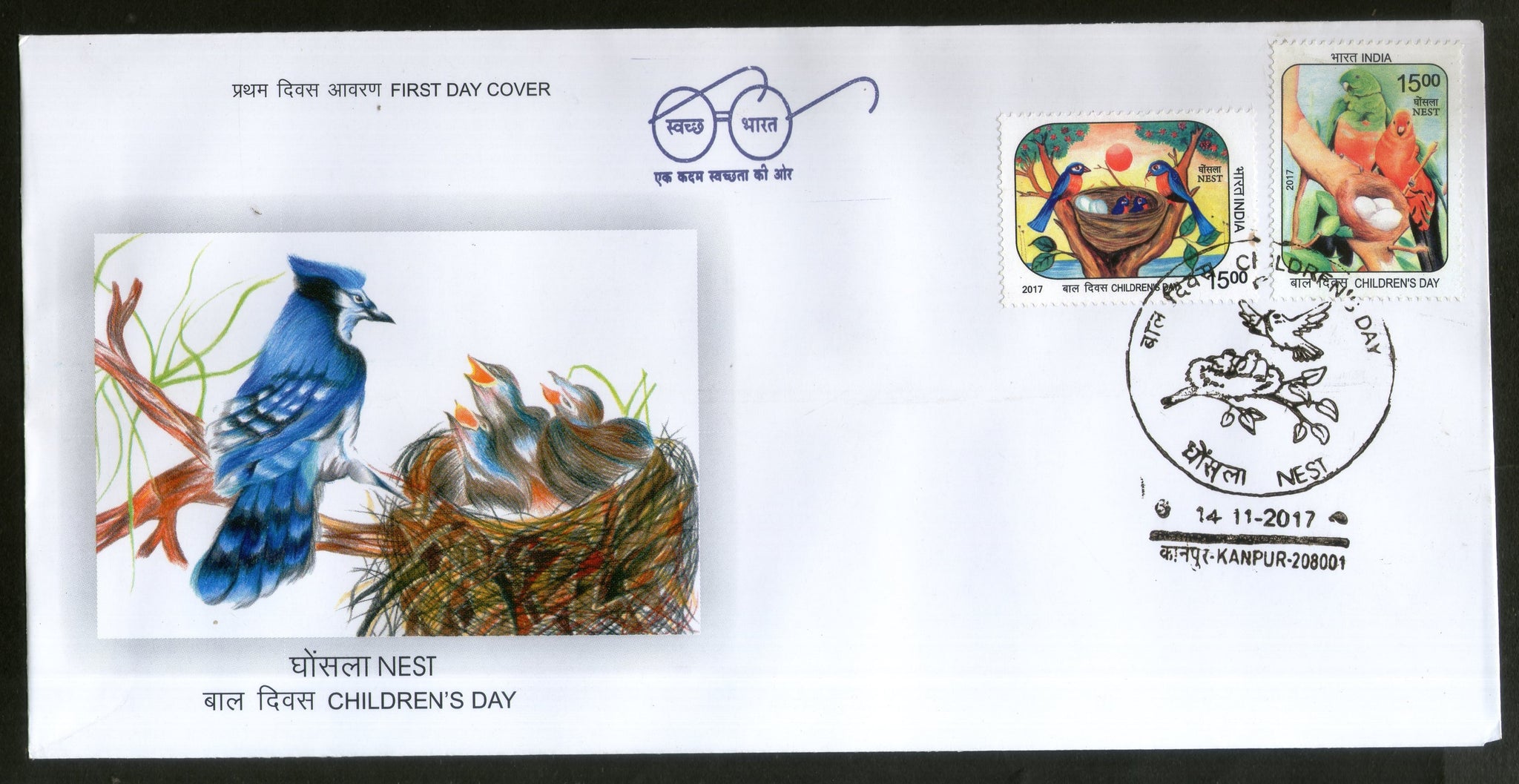 India 2017 Children's Day Paintings Nest Egg Birds Parrot Wildlife 2v FDC