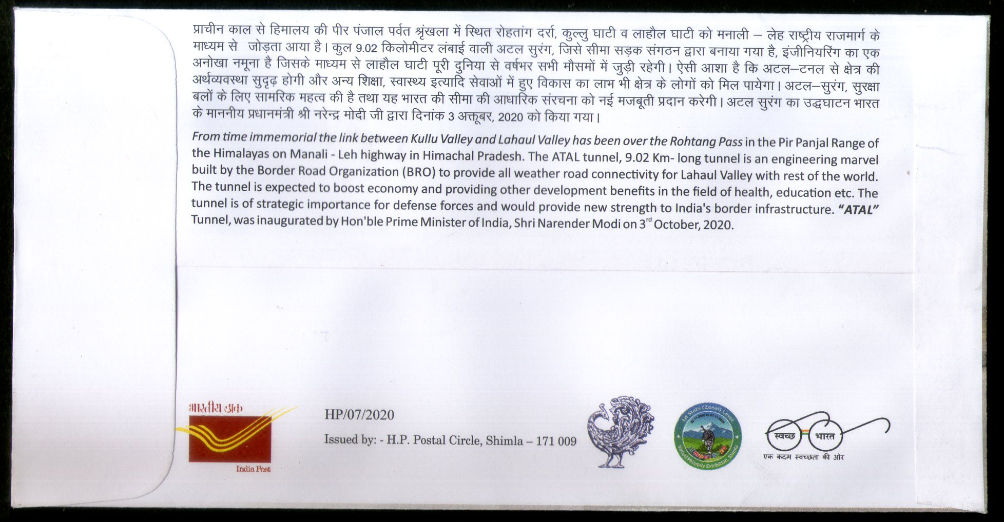 India 2020 Atal Tunnel Rohtang Himalaya Mountain Special Cover # 18106
