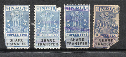 India Fiscal 1958´s Rs.5&10 Share Transfer Revenue Stamp Used x4 # 1026