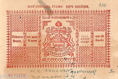 India Fiscal Bikaner State 4As Non Judicial Stamp Paper Type45 KM454 # 10504F