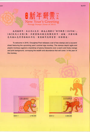 Taiwan Rep. of China 2015 Chinese New Year of Monkey 2v MNH Presentation Folder # 7908