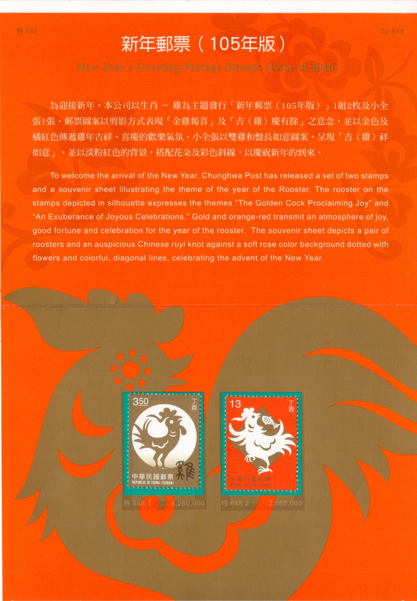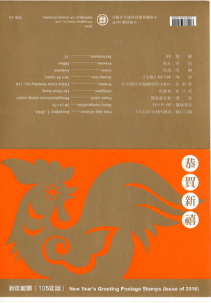 Taiwan Rep. of China 2016 Chinese New Year of Rooster 2v MNH Presentation Folder # 7587