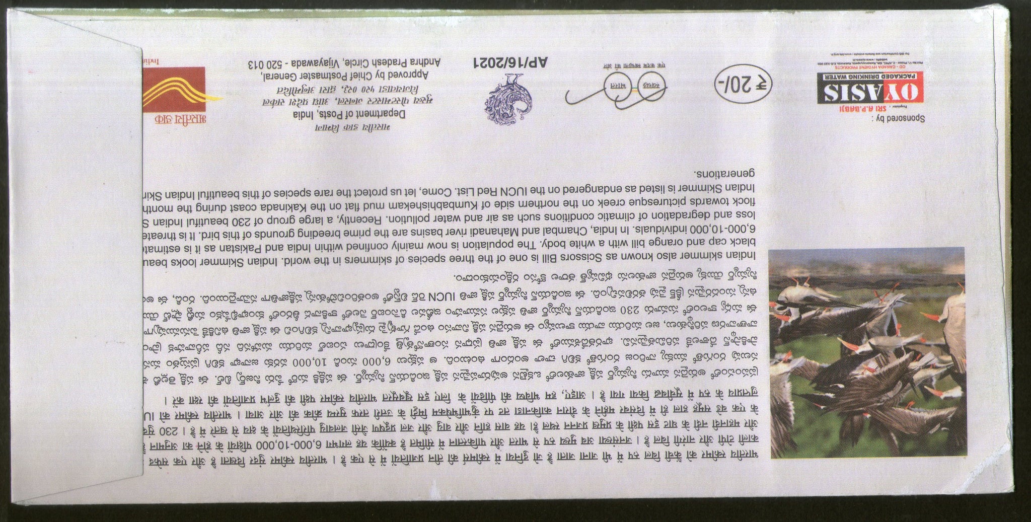 India 2021 Indian Skimmer Scissors Bill Birds Wildlife Special Cover # 18655