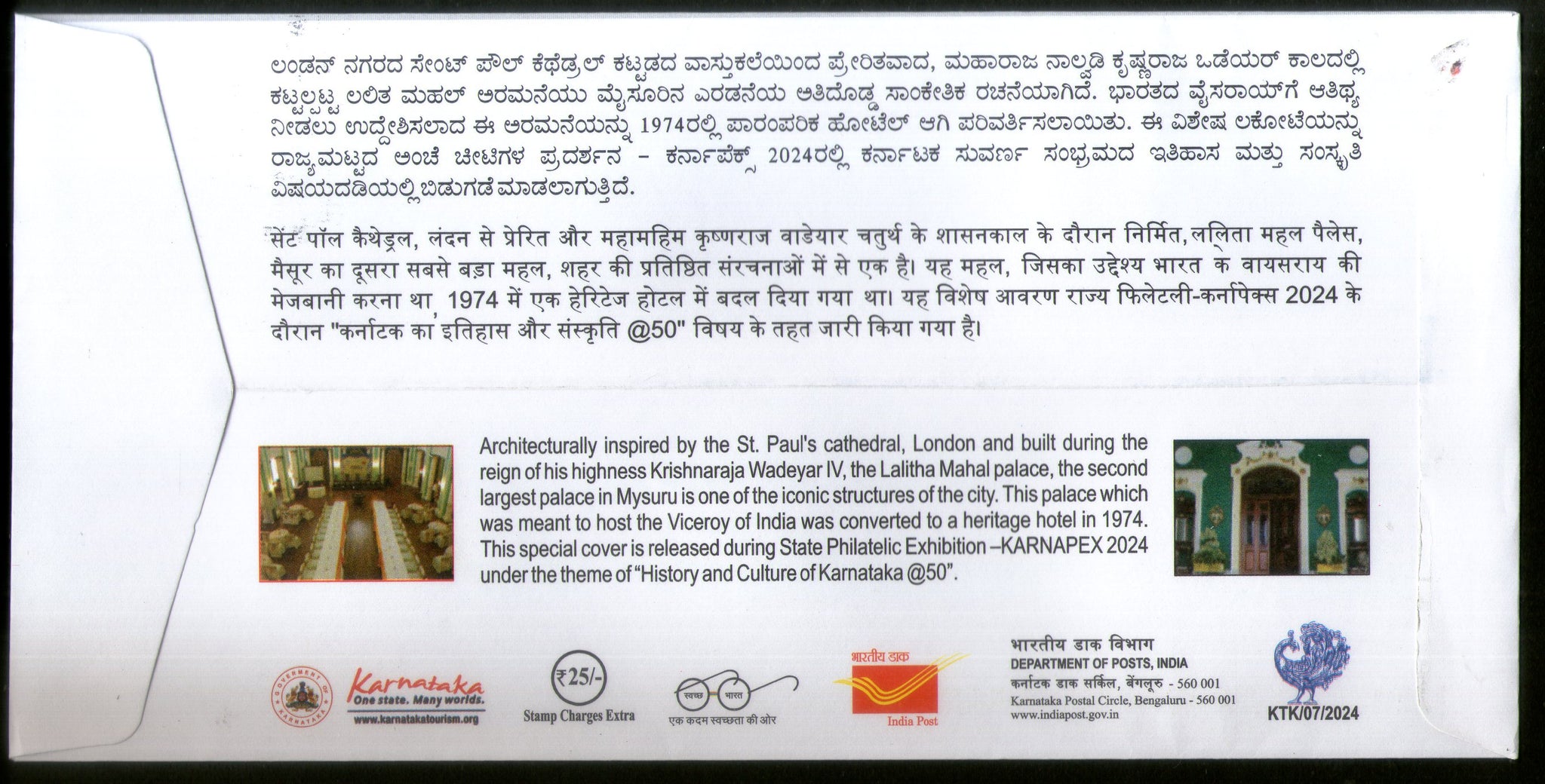India 2024 Lalitha Mahal Palace Heritage Building KARNAPEX Special Cover # 7384