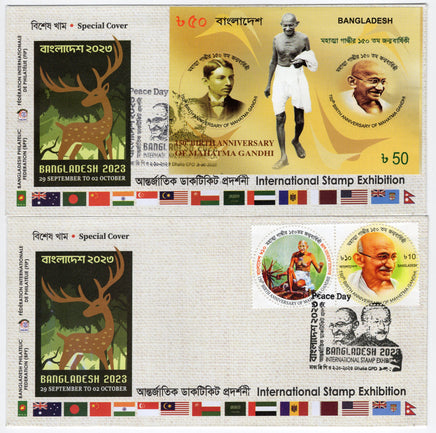 Bangladesh 2023 Mahatma Gandhi & Mujiboor Rahman Flags M/s + 2v Odd Shape FDCs # 6106