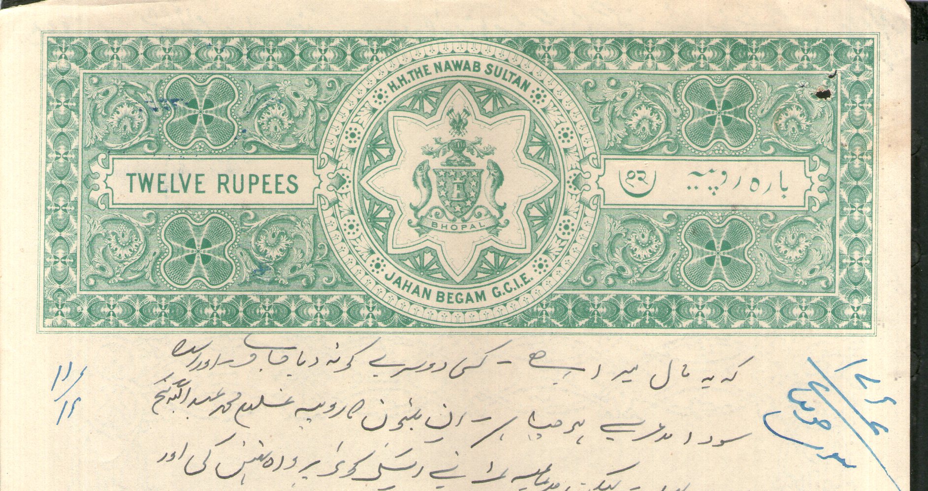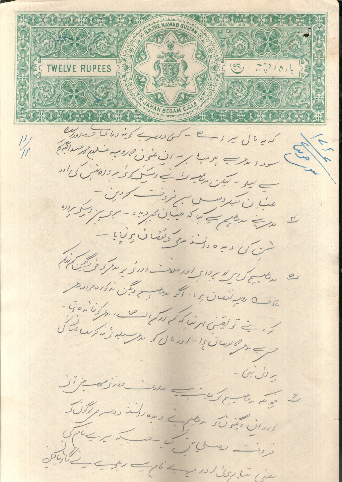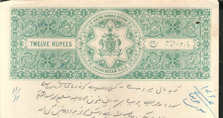India Fiscal Bhopal State 12 Rs Stamp Paper Type 15 Revenue Court Fee # 10459A