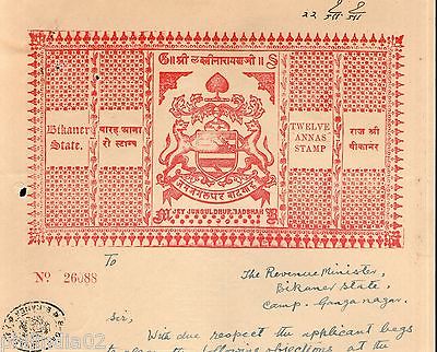 India Fiscal Bikaner State 12As Coat of Arms Stamp Paper Type 75 KM 759 # 10222B