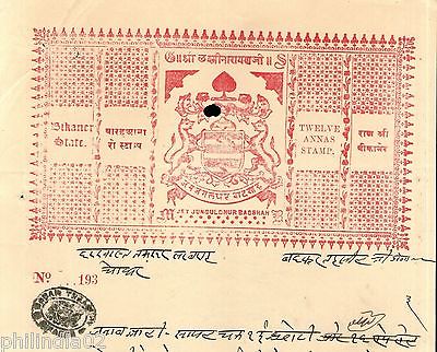 India Fiscal Bikaner State 12As Coat of Arms Stamp Paper Type 75 KM 759 # 10222C