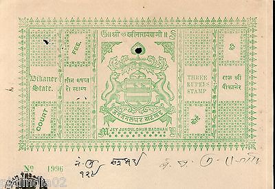 India Fiscal Bikaner State 3 Rs Coat of Arms Stamp Paper TYPE 10 KM 109 # 10218A