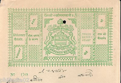 India Fiscal Bikaner State 3 Rs Coat of Arms Stamp Paper TYPE 10 KM 109 # 10218B