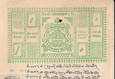 India Fiscal Bikaner State 3 Rs Coat of Arms Stamp Paper TYPE 10 KM 109 # 10218C