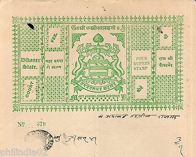 India Fiscal Bikaner State 4 Rs Coat of Arms Stamp Paper Type 10 KM 110 # 10220