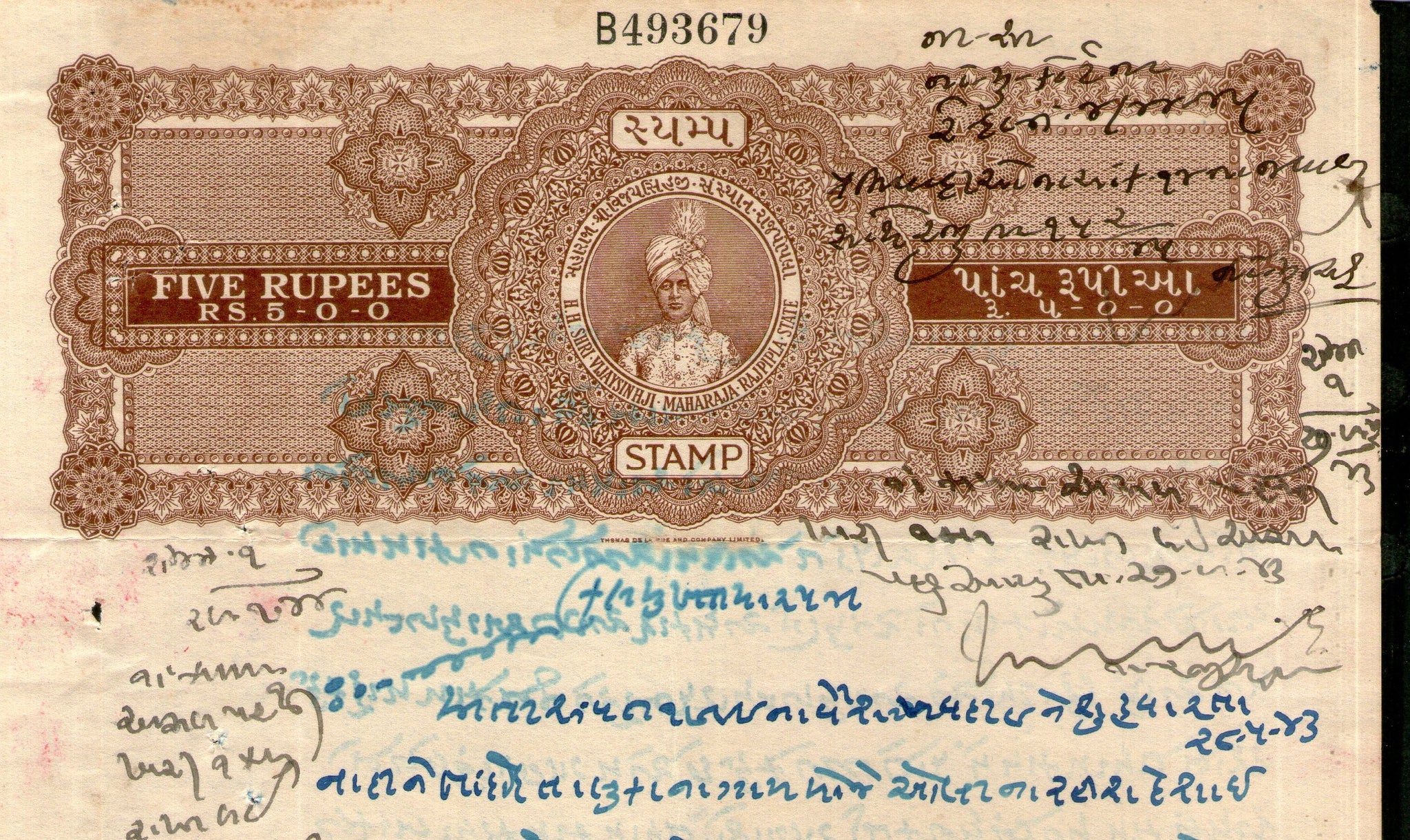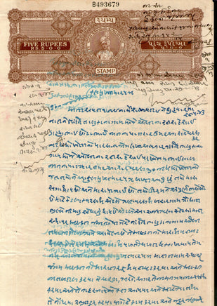 India Fiscal Rajpipla State 5Rs King Vijaysinhji T20 KM 212 Stamp Paper # 10742S Free counters!