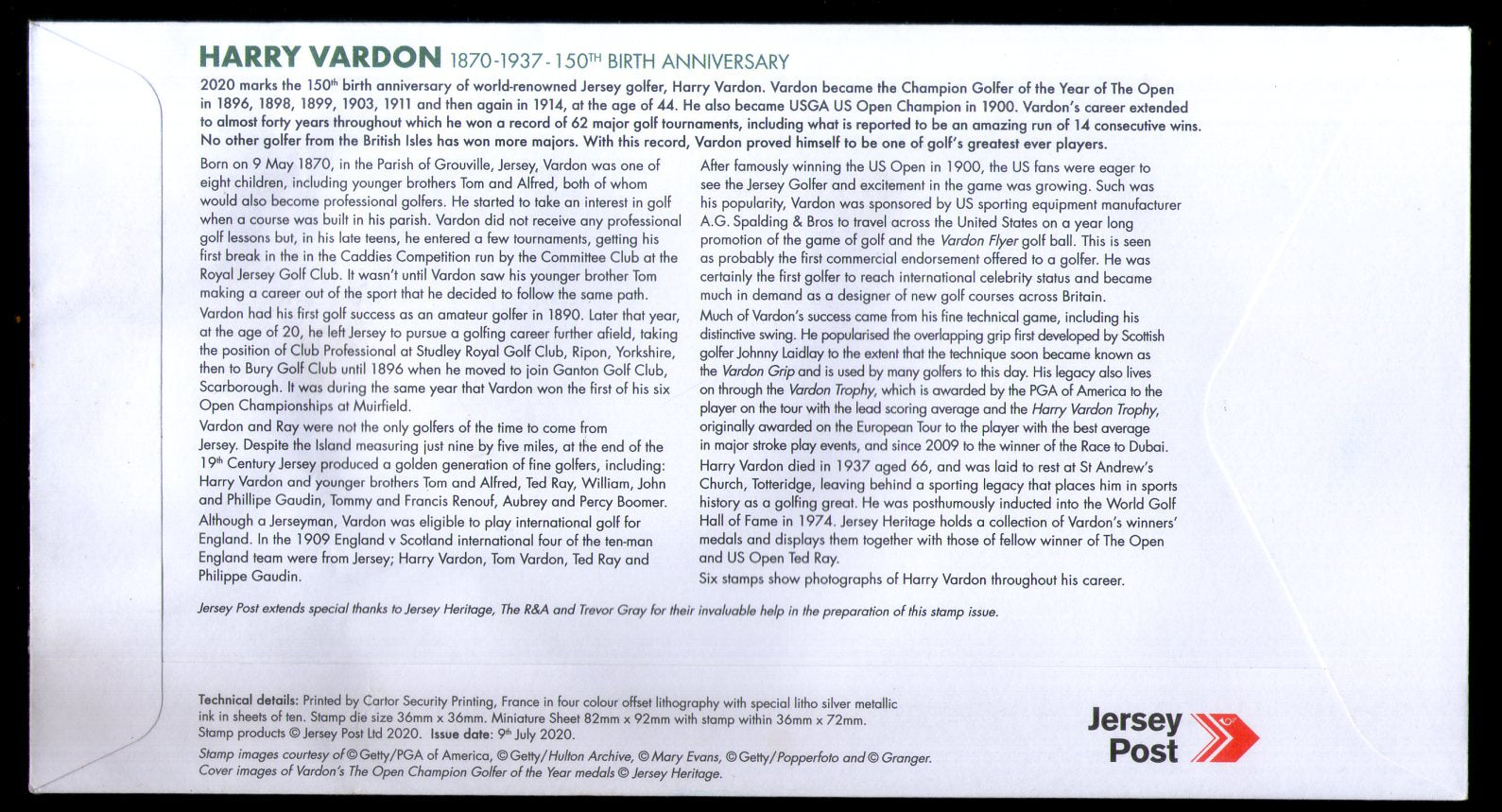 Jersey 2020 Harry Vardon Famous Golfer Sport 6v FDC # 18797