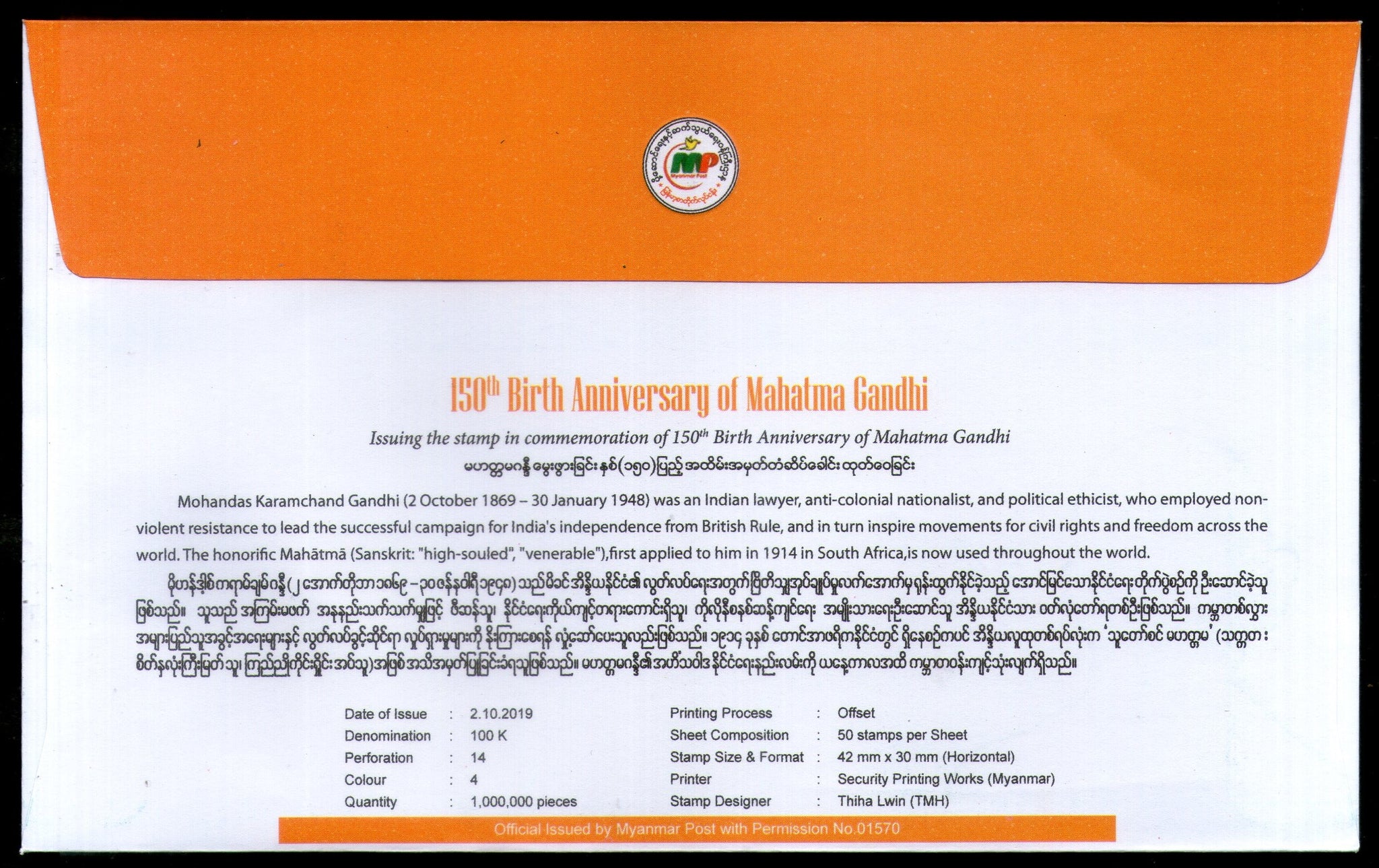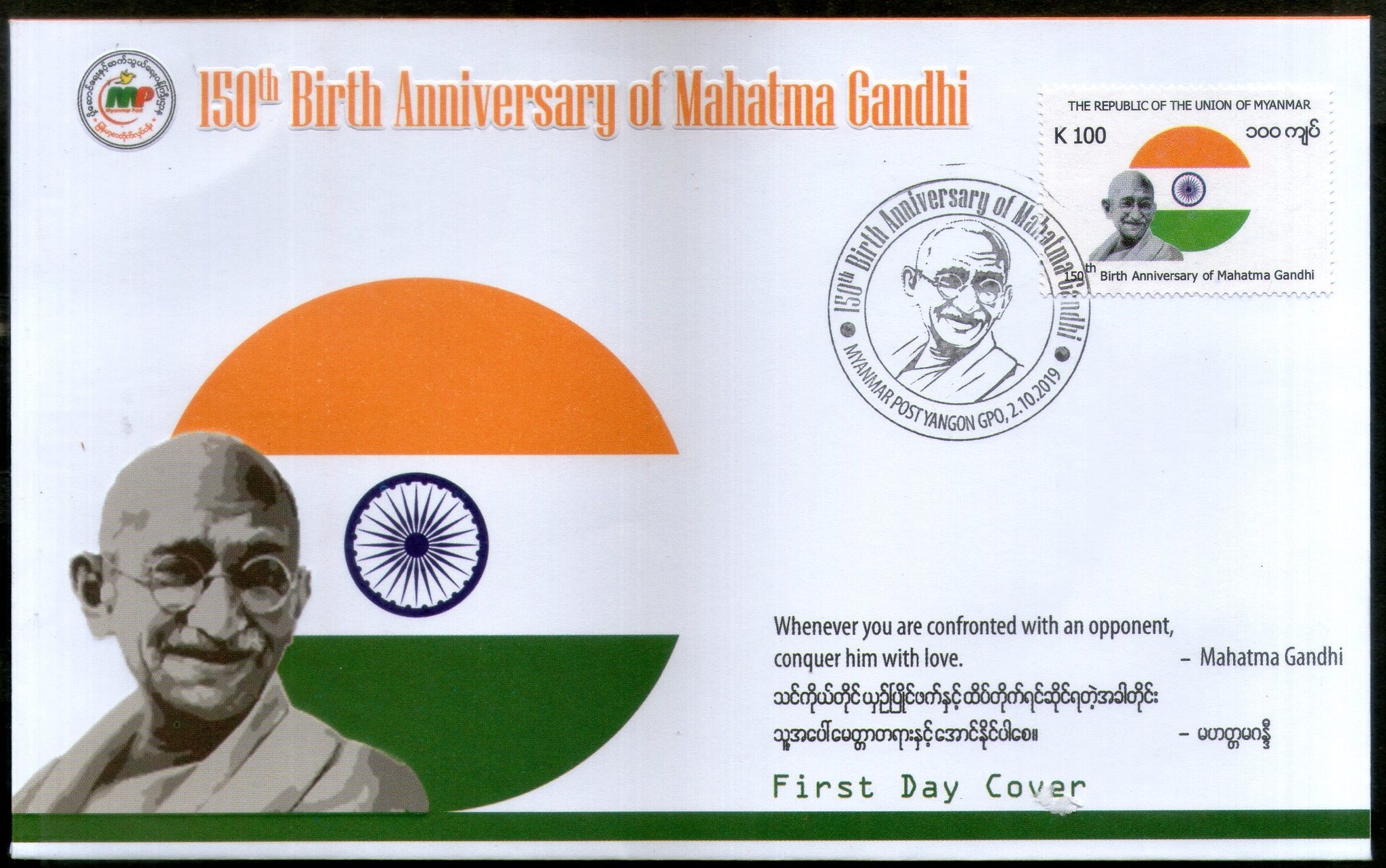Myanmar 2019 Mahatma Gandhi of India 150th Birth Anniversary Flag Official FDC # 180