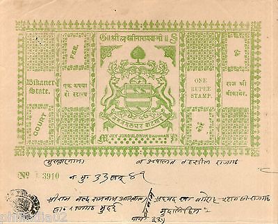 India Fiscal Bikaner State 1 Re Coat of Arms Stamp Paper TYPE 10 KM 106 # 10219C