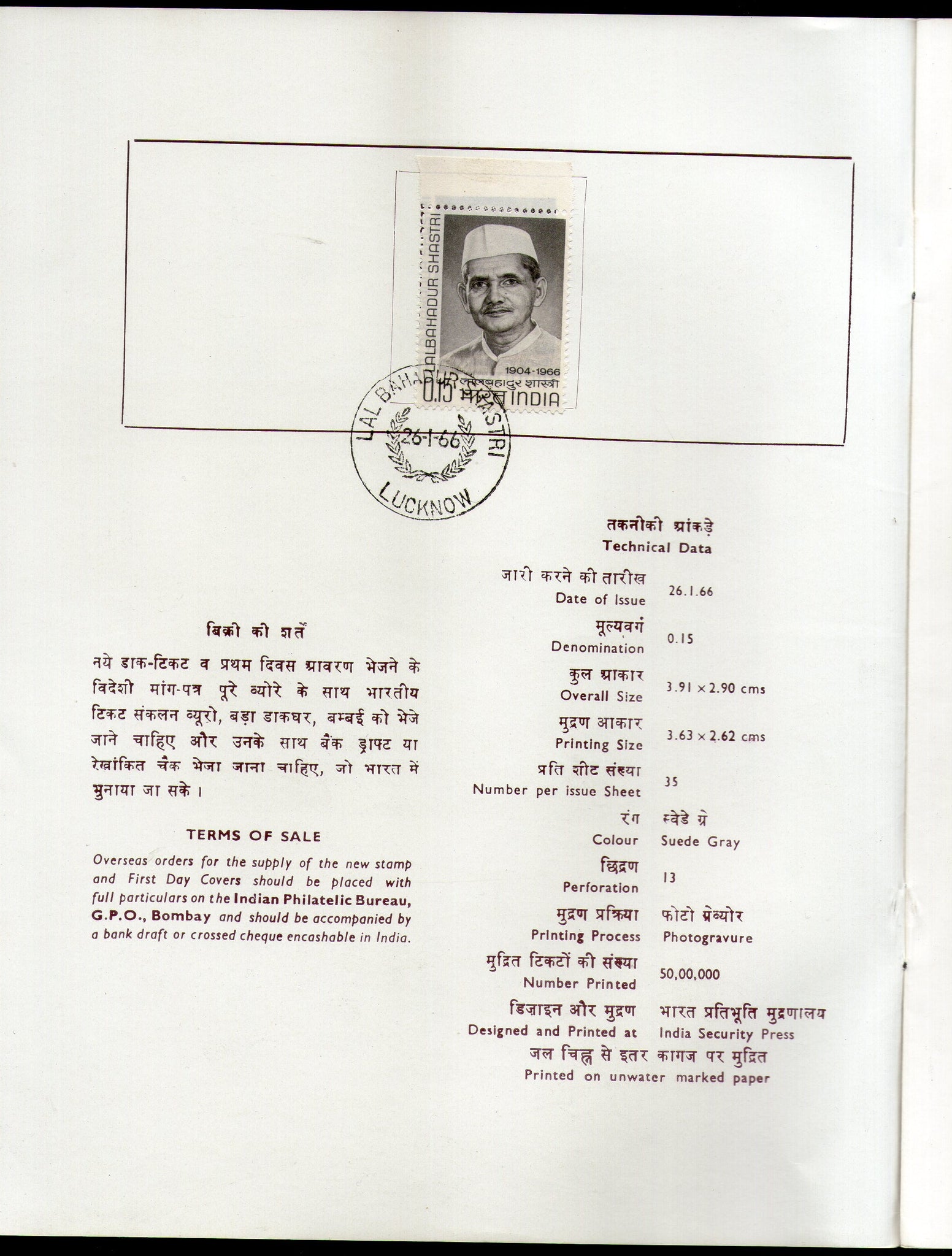 India 1966 Lal Bahadur Shastri Phila-426 Cancelled Folder