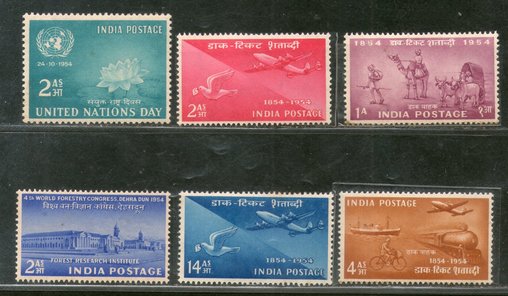 India 1954 Year Pack 6 Stamps Stamp Centenary Forestry Congress Mail Transport Aviation MNH