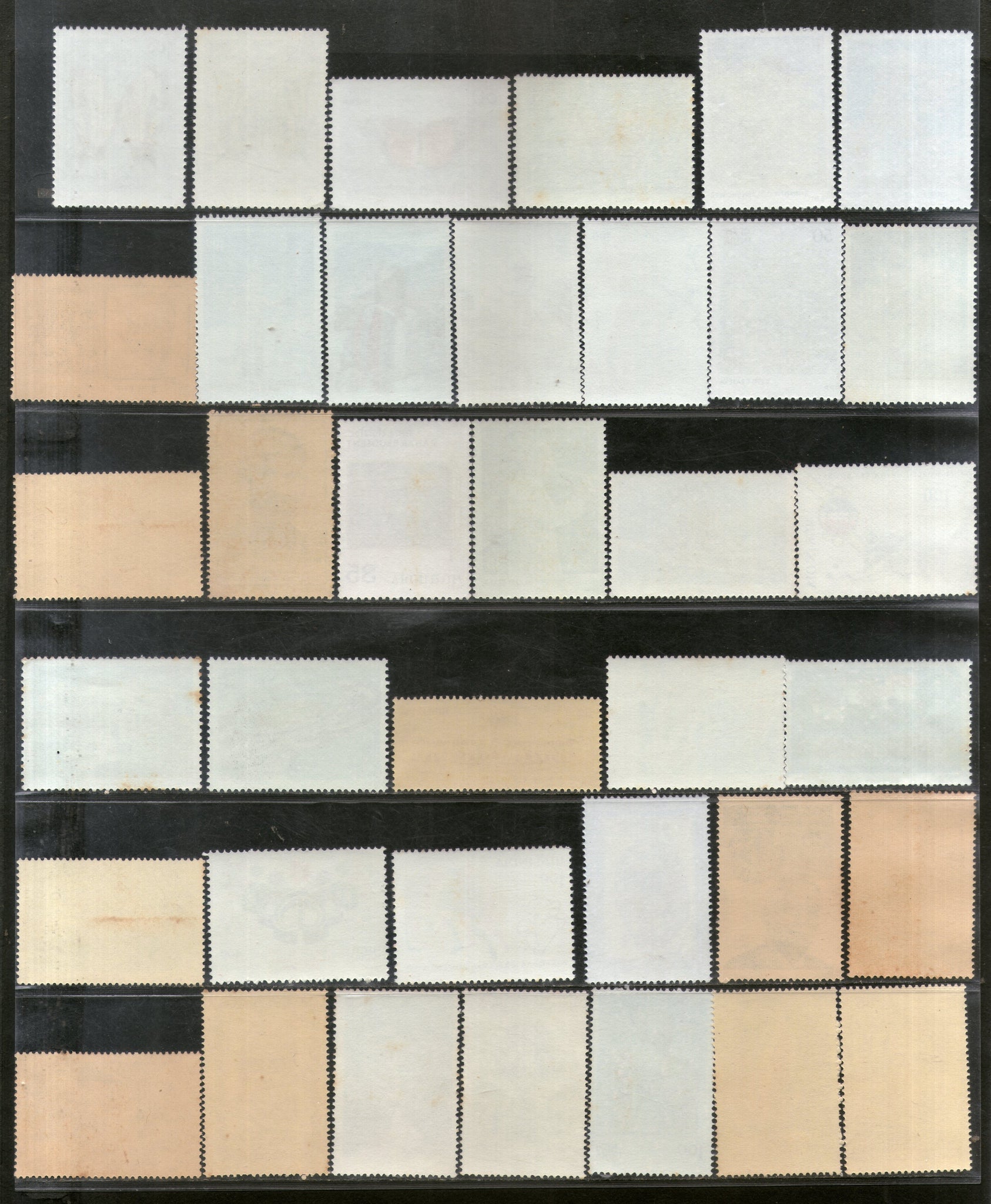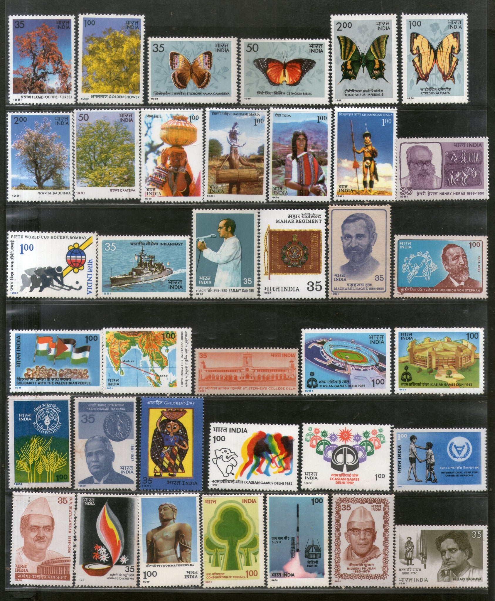 India 1981 Year Pack of 37 Stamps Butterfly Game Tree Gandhi Tribes Hockey Flag Children's Day MNH