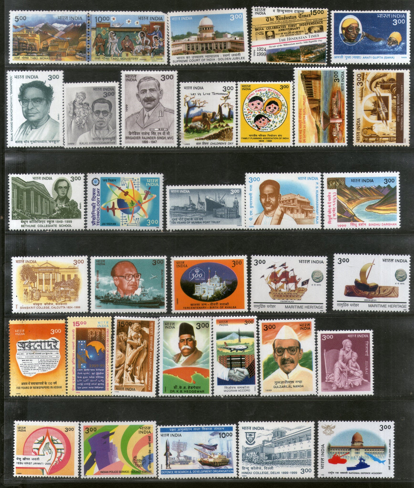 India 1999 Year Pack 62 Stamps Arts Craft Lion Ship DRDO Sikhism Military Sculpture MNH