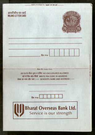 India 1992 75p Peacock Inland Letter Card with Bharat Overseas Bank Advertisement ILC MINT # 324FL