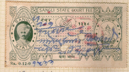 India Fiscal Sangli State 12As King Type 1 KM 16 Court Fee Revenue Stamp # 951