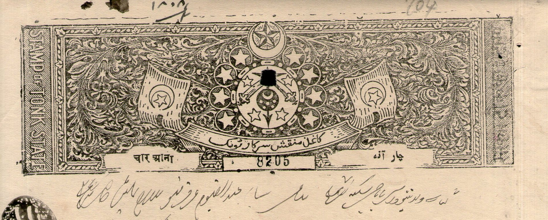 India Fiscal Tonk State 4 As Coat of Arms Stamp Paper TYPE 75 KM 754 # 10307A