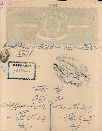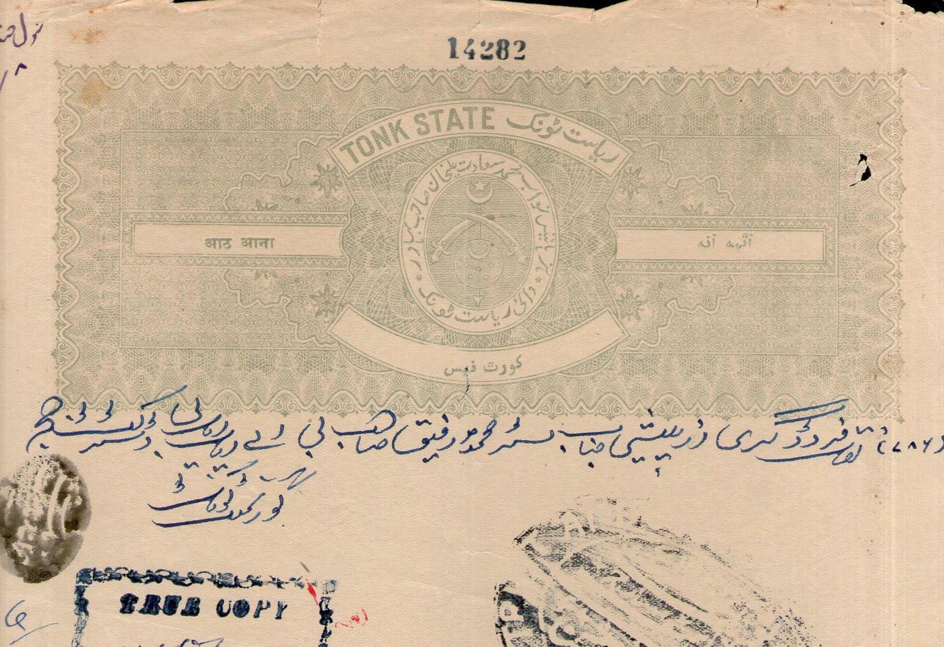 India Fiscal Tonk State 8 As Coat of Arms Stamp Paper TYPE 40 KM 405 # 10302A