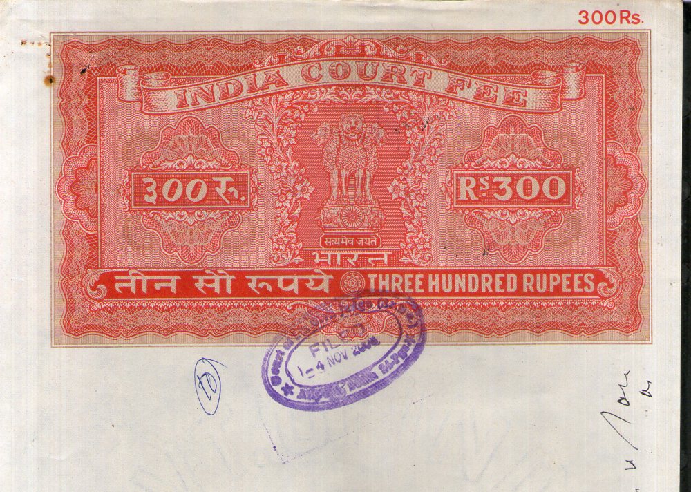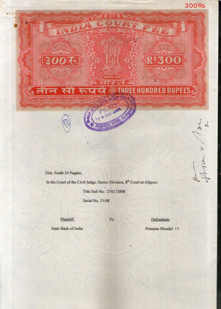 India Fiscal Rs. 300 Ashokan Stamp Paper Court Fee Revenue WMK-16 Fine Used # 4