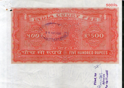 India Fiscal Rs. 500 Ashokan Stamp Paper Court Fee Revenue WMK-16 Fine Used # 70
