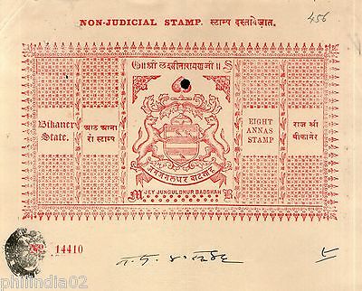 India Fiscal Bikaner State 8As Coat of Arms Stamp Paper Type 45 KM 456 # 10939B