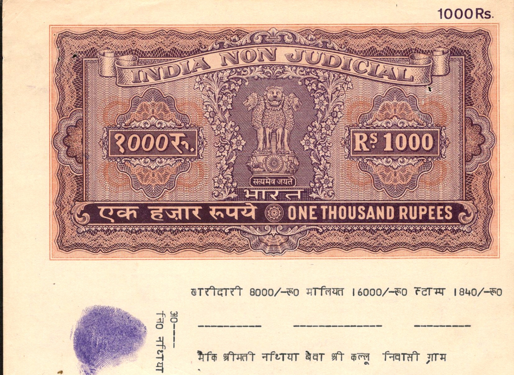 India Fiscal Rs.1000 Ashokan Stamp Paper Court Fee Revenue WMK-17 Good Used # 32D
