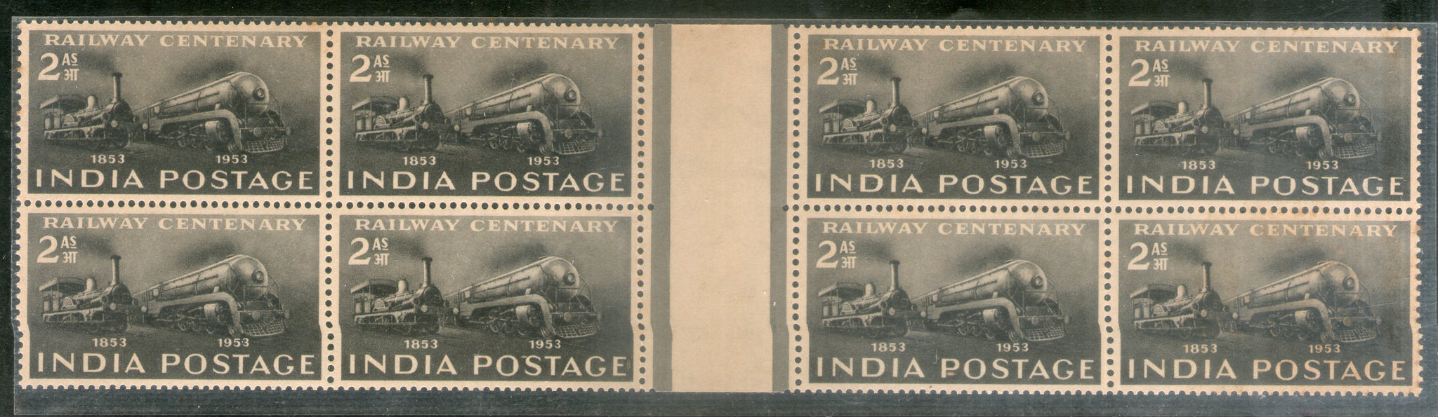 India 1953 2As Railway Cent. Phila-307 in BLK/4 GUTTER PAIR MNH RARE # 6326