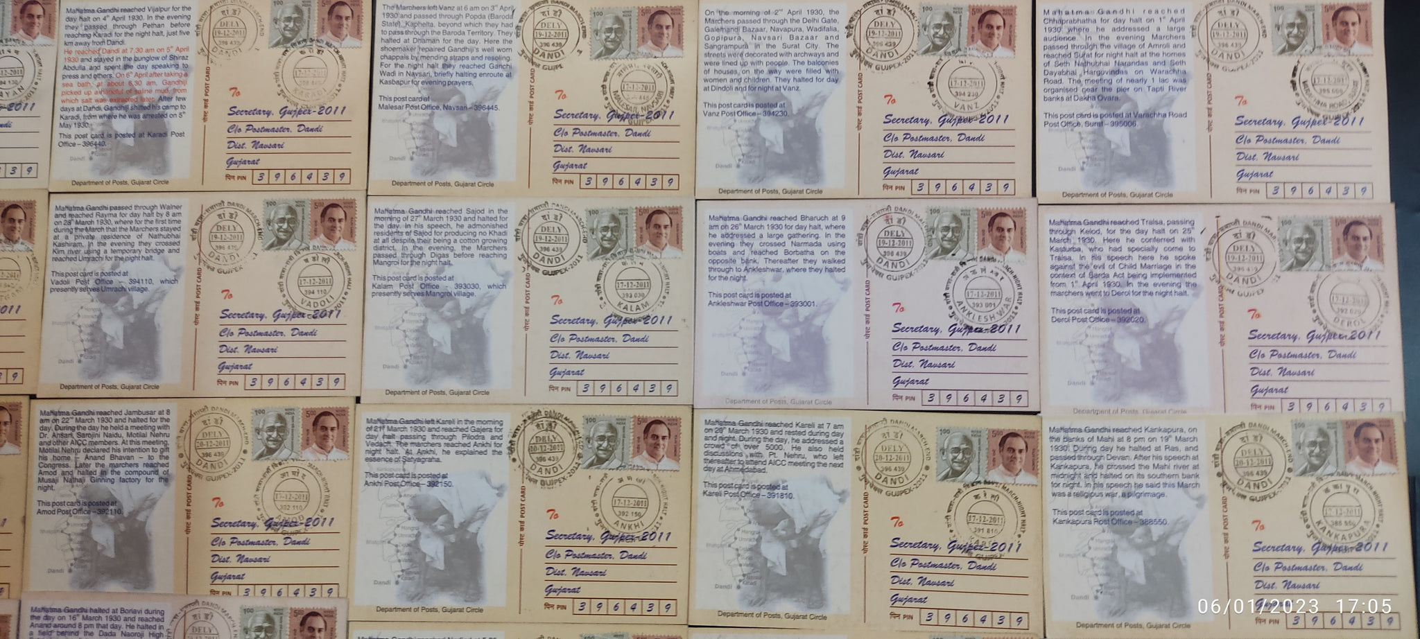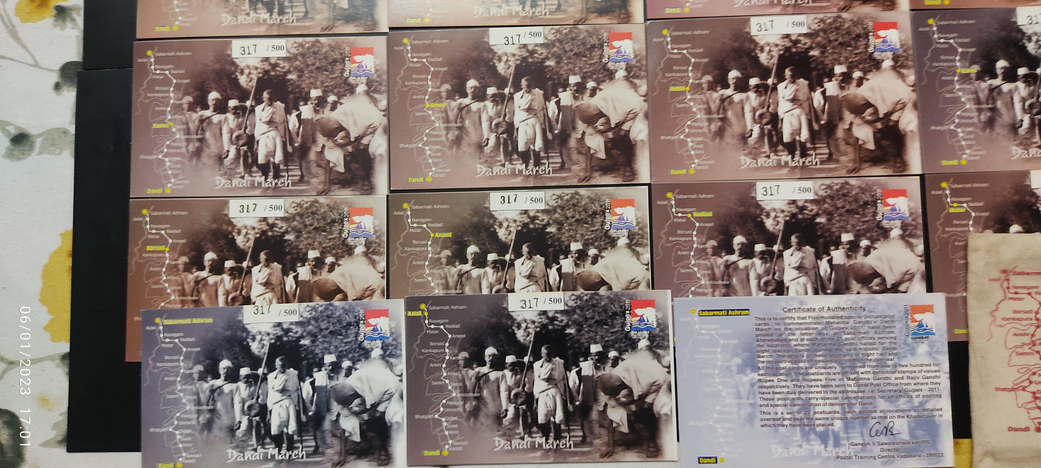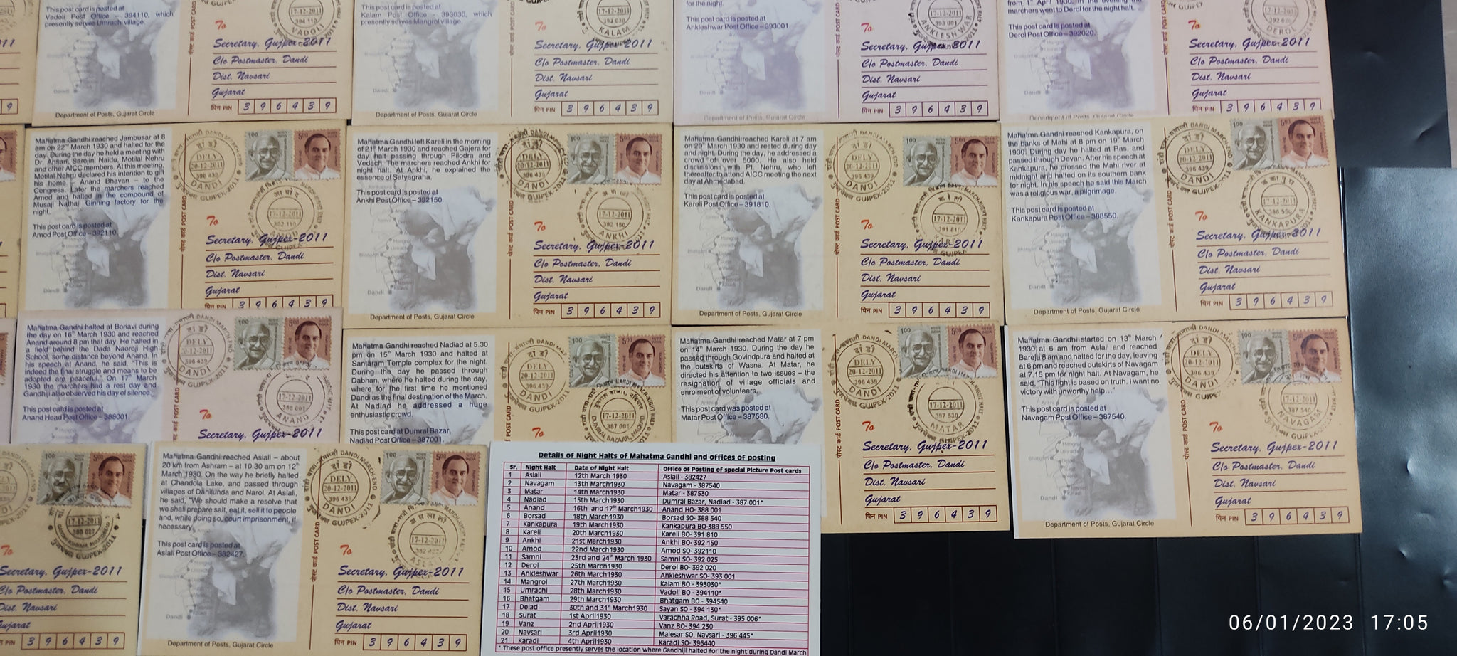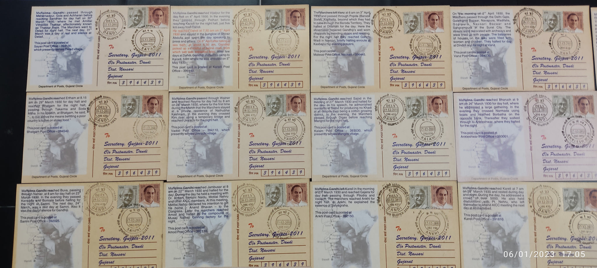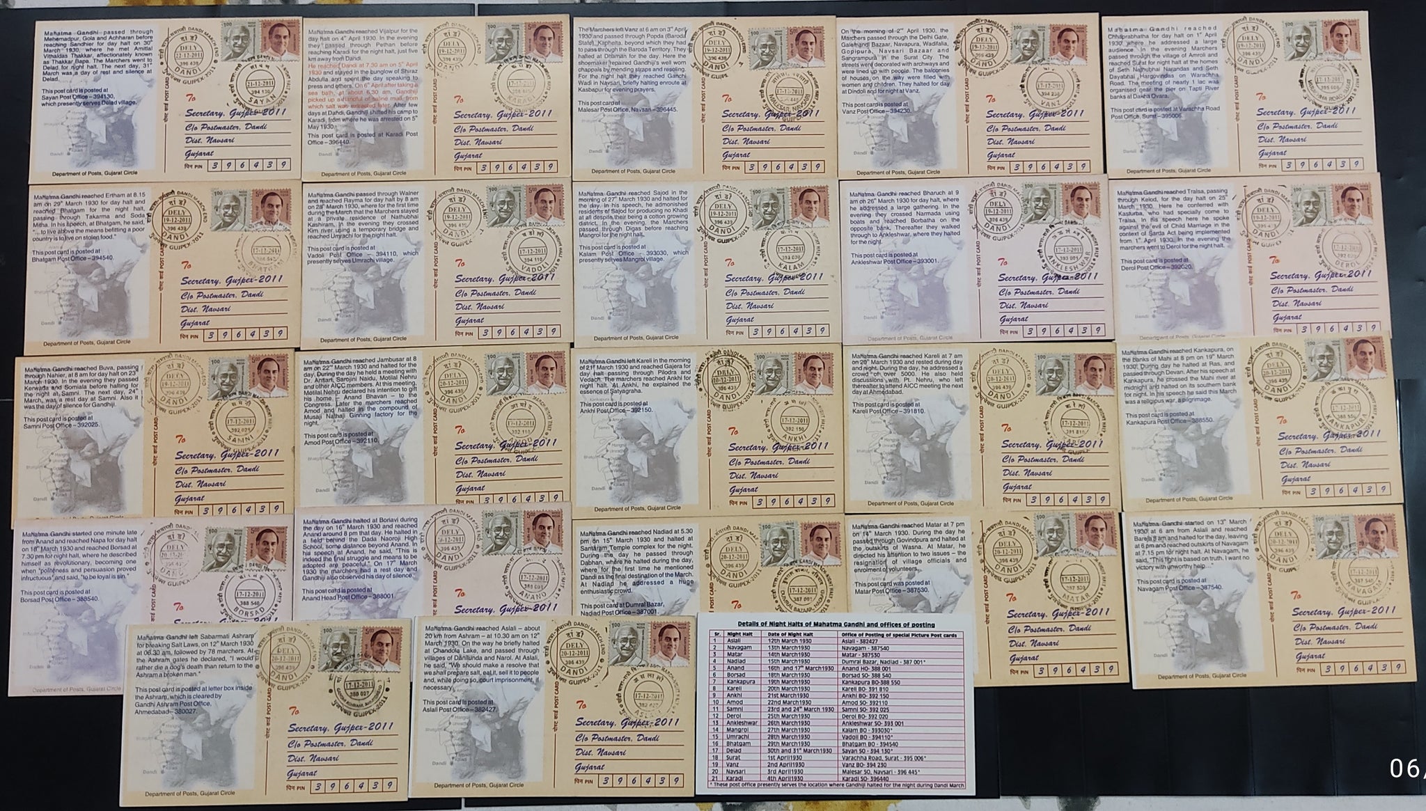 India 2011 22 Diff. Mahatma Gandhi Dandi March GUJPEX  Cancelled Post Cards with Khadi Cloth Envelope RARE