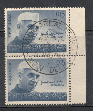India 1964 Jawaharlal Nehru Mourning Issue Phila-403 First Day Cancelled Pair Stamp # 831