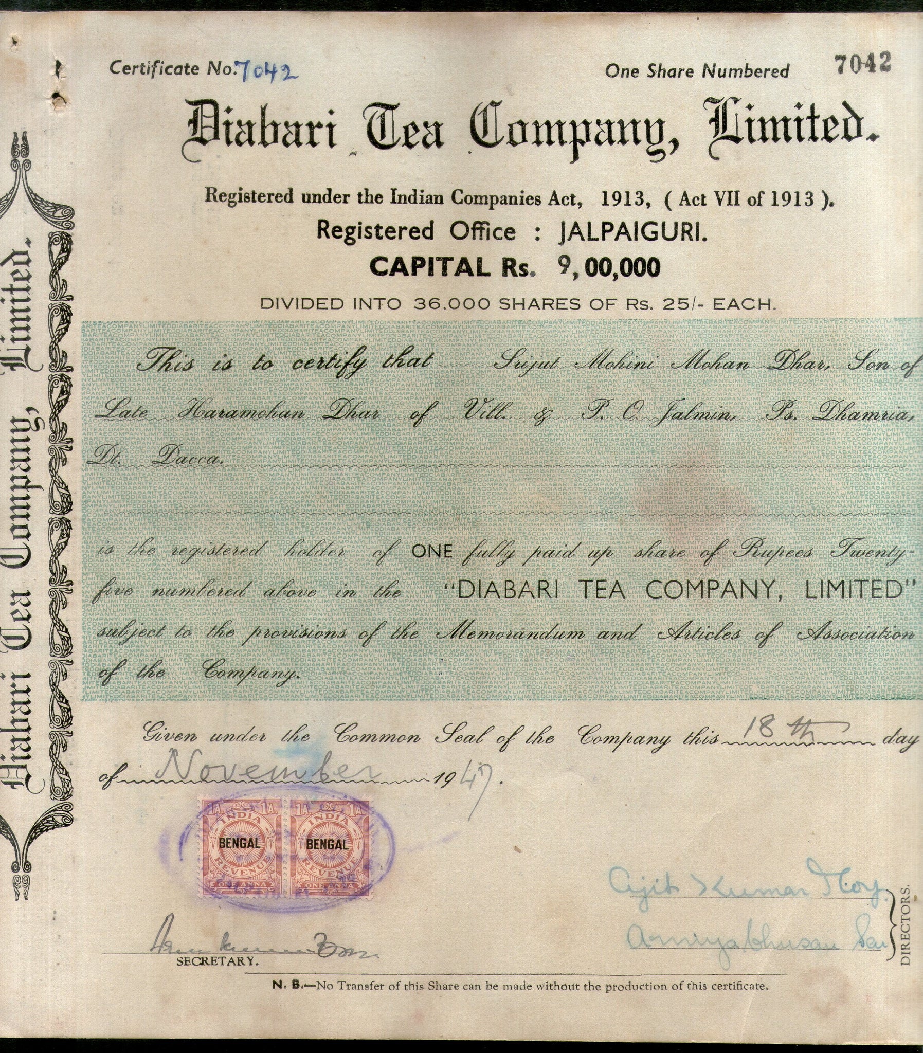 India 1940's Diabari Tea Company Share Certificate with Revenue Stamp # 10385