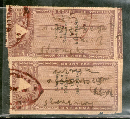 India Fiscal Kathiawar State QV 1An x2 Court Fee Revenue Used # 5846