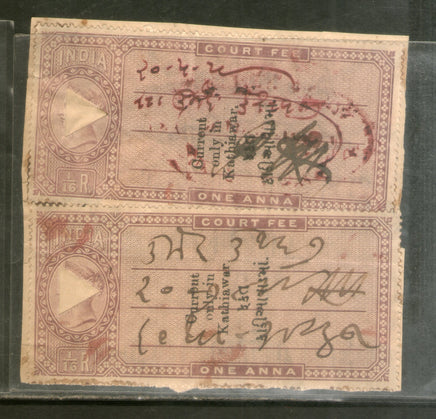 India Fiscal Kathiawar State QV 1An x2 Court Fee Revenue Used # 5903