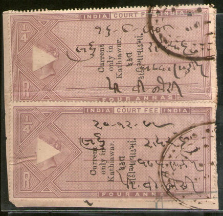 India Fiscal Kathiawar State QV 4As x2 Court Fee Revenue Used # 5720