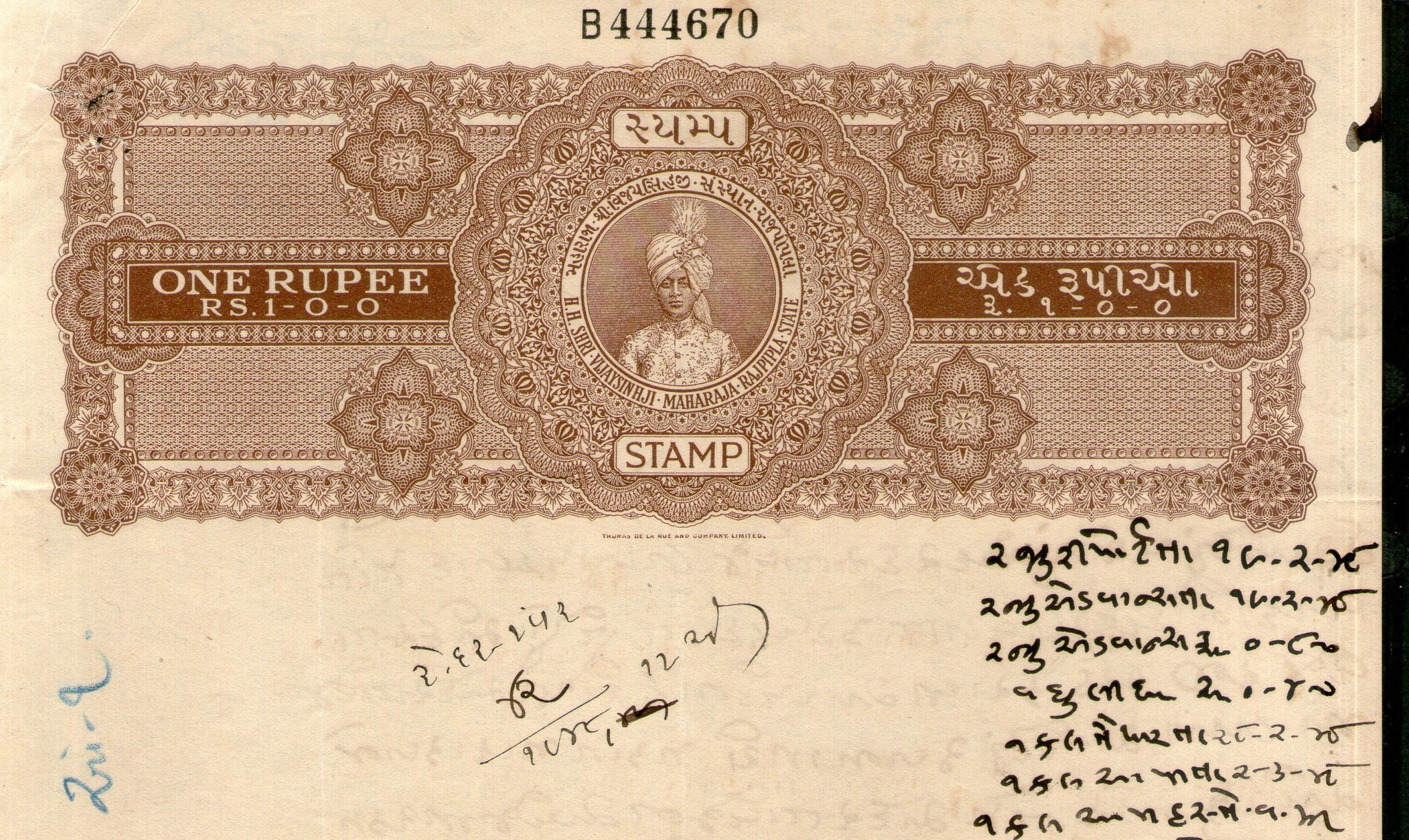 India Fiscal Rajpipla State 1Re King Vijaysinhji T20 KM 207 Stamp Paper # 10742K