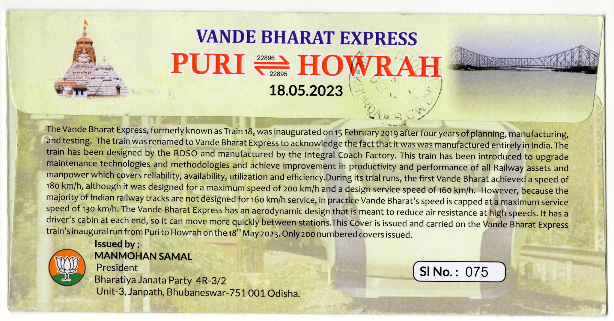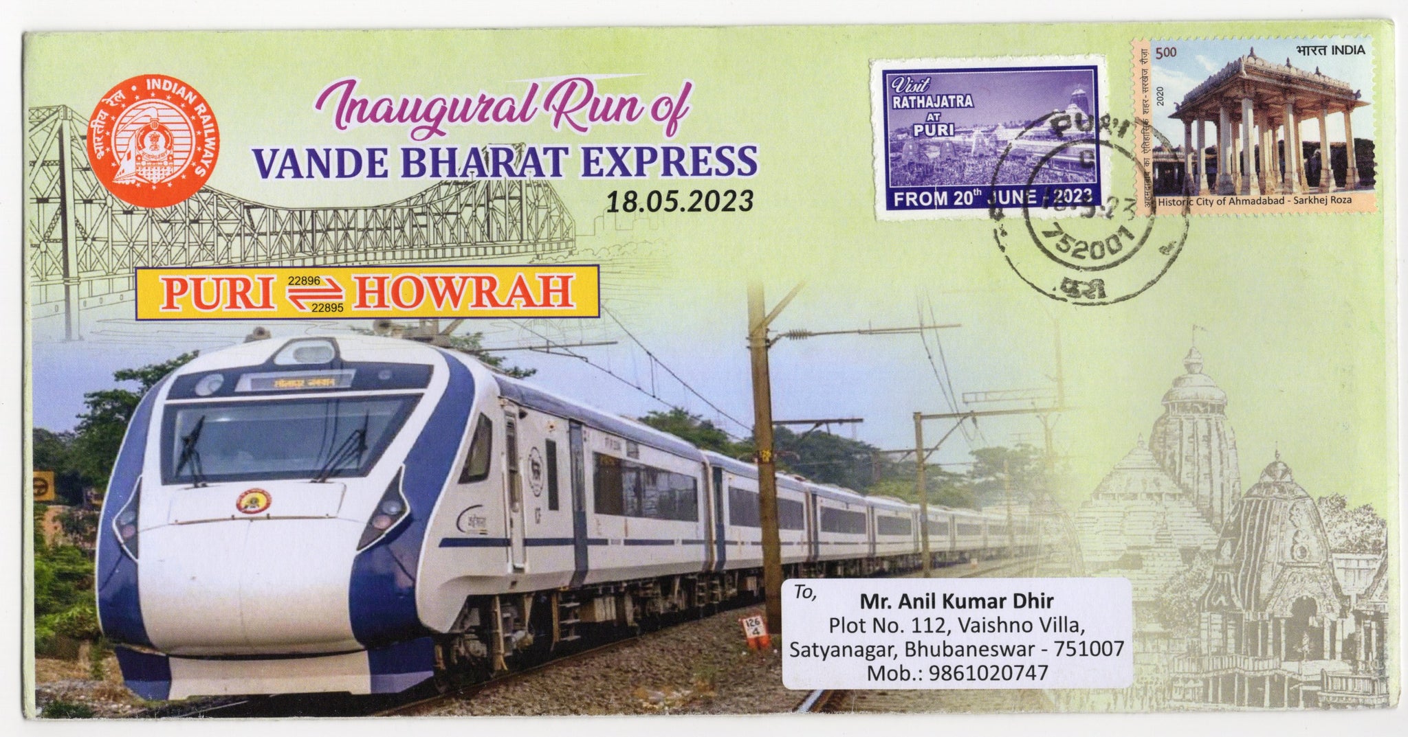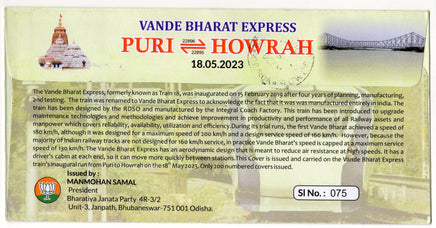 India 2023 Vande Bharat Express Rath Yatra Label Puri to Hawrah Bridge Train Locomotive Special Cover # 7115