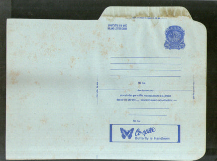 Carte postale intérieure de 20 pence, Inde 1978, motif paon, avec papillon Co-Optex, publicité textile tissée à la main, ILC MINT # 121