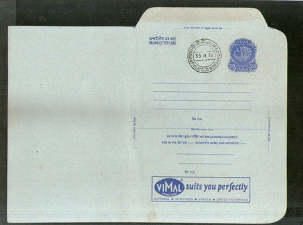 Carte postale intérieure de 20 pence, Inde, 1978, motif paon, avec publicité textile pour chemises et costumes Vimal, ILC, état neuf n° 129FD