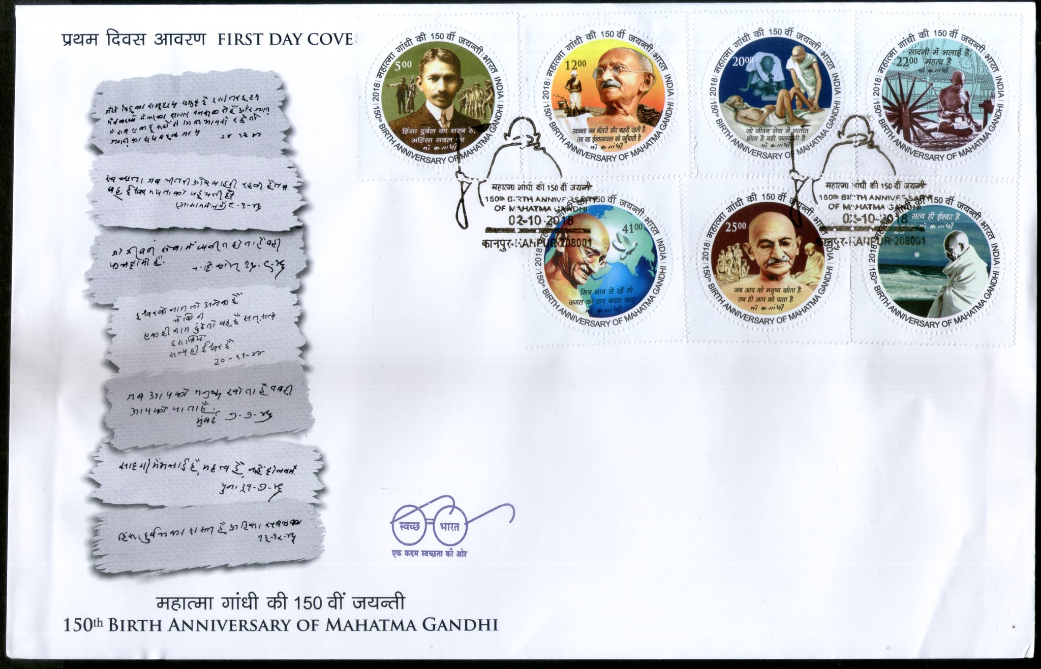 Timbre rond de forme étrange 7v FDC, Inde 2018, 150e anniversaire de la naissance du Mahatma Gandhi