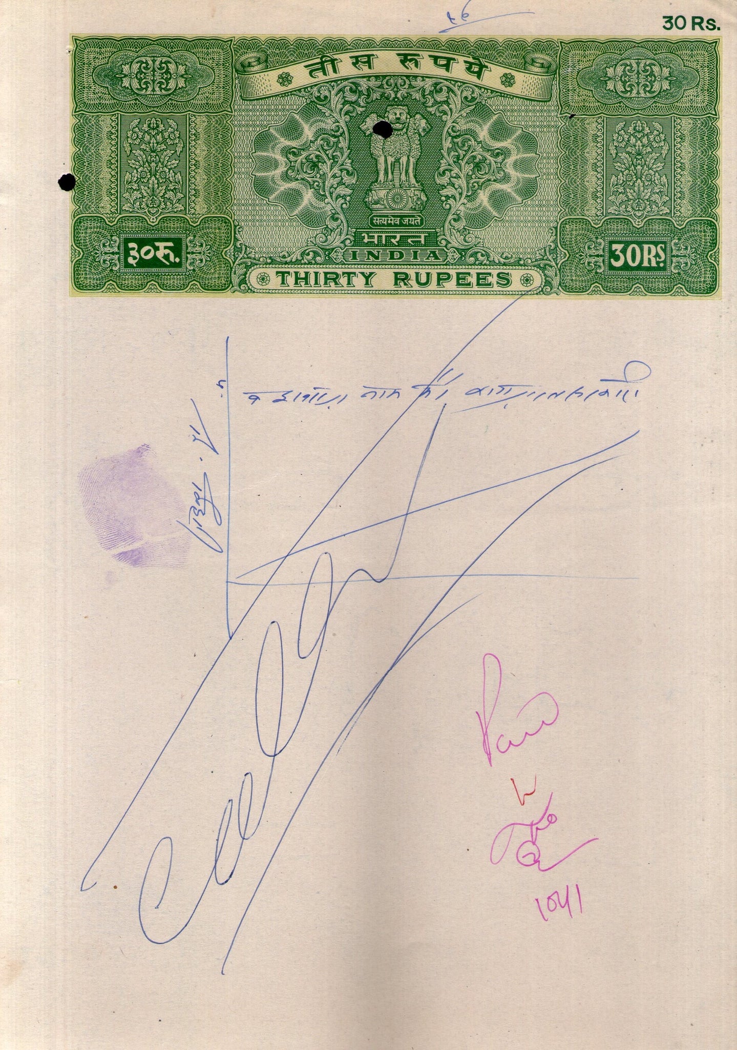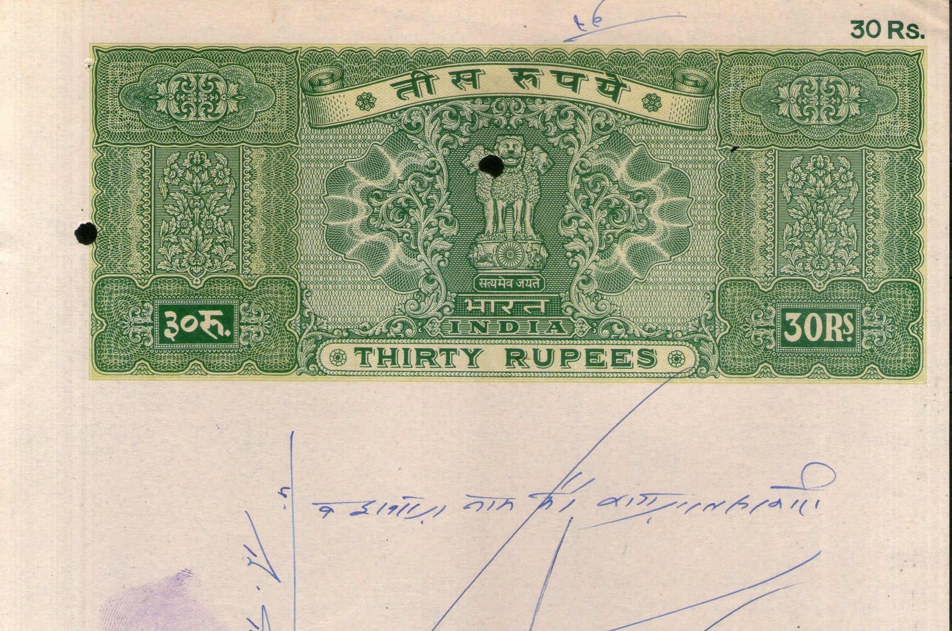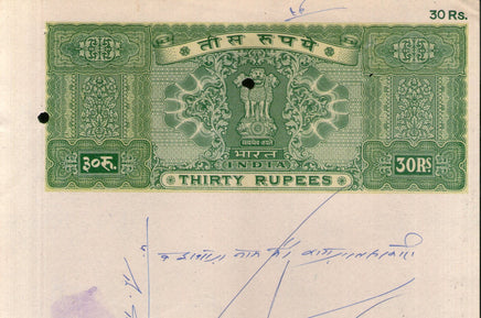 Papier timbre fiscal indien Rs.30 Ashokan pour frais de justice WMK-17, bon état, utilisé, n° 90